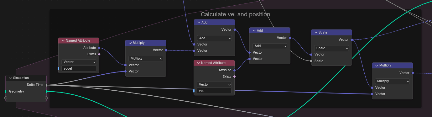 Now we come to update the leaf’s velocity and position. First we grab the accel attribute and multiply it by Delta Time to get the velocity contribution. We then add this to the velocity contribution from the turbulence simulation, and add that change in velocity to the existing vel attribute. The Scale node then scales the overall velocity by the fInFreefall value.