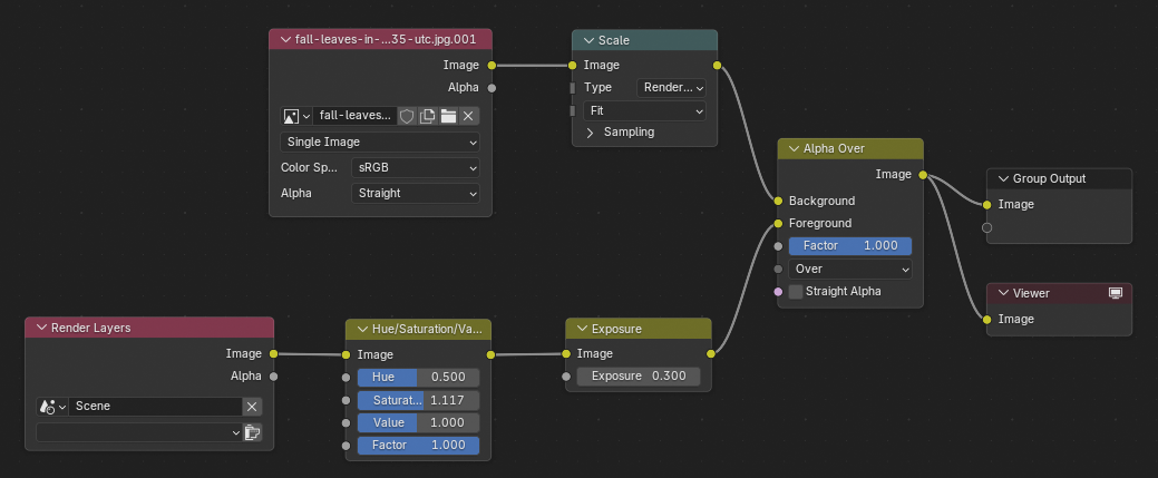 Lastly we have the compositing setup. We just use some global Hue, Saturation and Value nodes to adjust the colour of the leaves to match the plate, and an Exposure node to adjust the brightness. The leaves are then composited over the plate using the alpha channel.