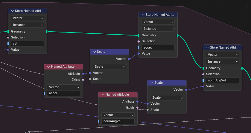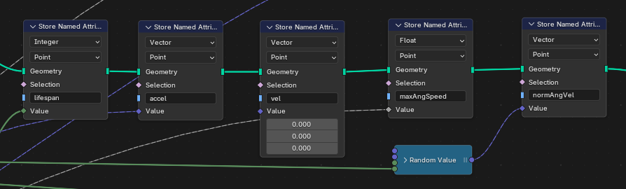 Now we need to set the initial values for the Named Attributes we’ll be using during the simulation. The input values are primarily sourced from the Group Input node so we can easily experiment with different values outside of the GN editor.
