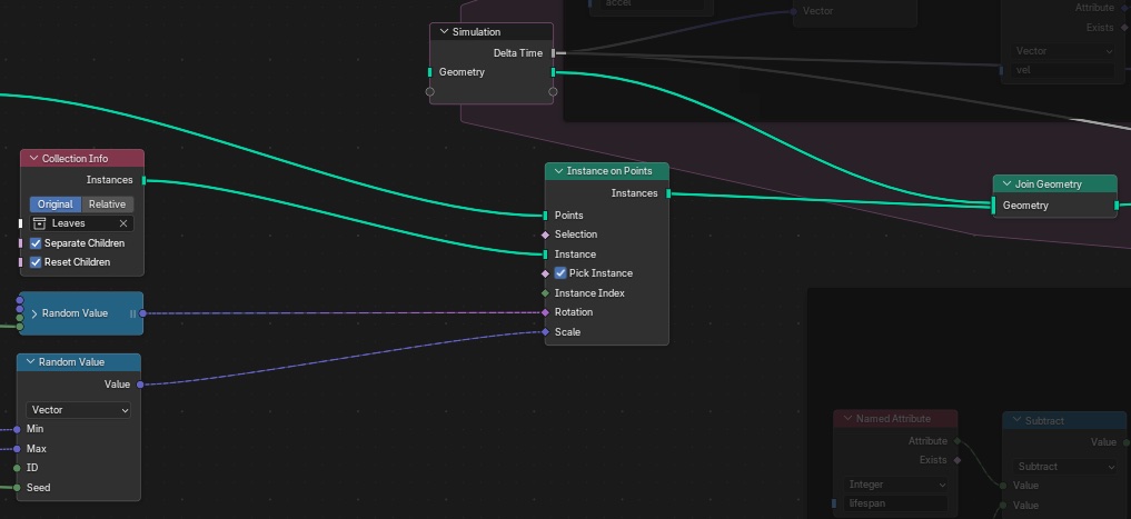 We instance our leaves as you might in a standard Geometry Node setup, but with a slight twist. Because we’re using a Simulation Zone, we have an existing source of geometry instances inherited from the previous frame. We want to merge these existing leaves in with our new instances, and then feed them into our network so that old and new are treated equally.