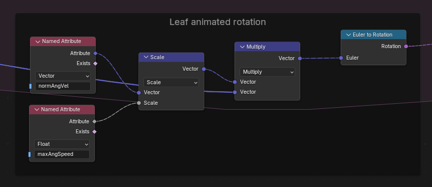 The angular velocity of each leaf, expressed as a Vec3. This is given a random vec3 from -1 to 1. This is multiplied with maxAngSpeed to calculate its rotation speed