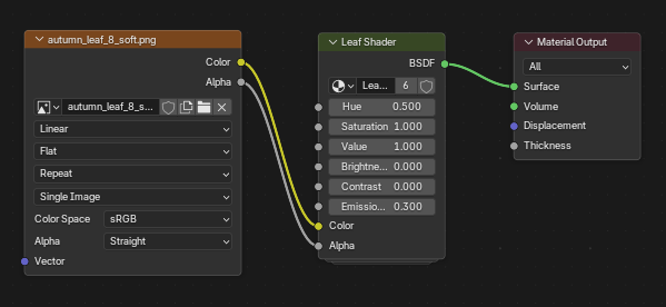 The only other point of note here is the use of the leafFadeOut attribute to control the opacity of the leaves. In order to be able to use this shader when there is no attribute set, we rely on the default value of 0 meaning that the leaf is fully opaque. Because the attribute is the inverse of what we need to use for the alpha attribute of the standard Principled BSDF shader, we need to invert it before using it.