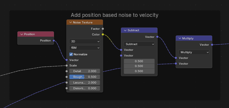 To provide a simple way to simulate the way leaves fall, we will sample a 3D fBM Noise Texture and add this to our leaf velocity, acting as a pseudo acceleration force. Before this is added to the leaf velocity, we scale it by an exposed value, allowing us to easily dial this strength up and down according to our needs.
