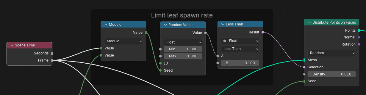 The first thing we need to do is control how many leaves we spawn. One of the first surprising things I encountered was that when using the Distribute Points on Faces node, we need to control the spawn count by the density of the points, not the number of points. This means that scaling the spawning zone geometry will change the number of leaves spawned per second.