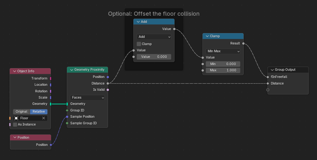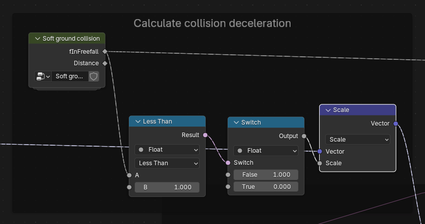 There are two ways we use the soft collider output. One is to directly use the fInFreefall value, which is 1 in freefall, and drops to a value below 1 during collision. We will demonstrate this later. The other is to convert our freefall value into an inverted collision boolean, where it has a value of 0 in freefall, and 1 during collision.