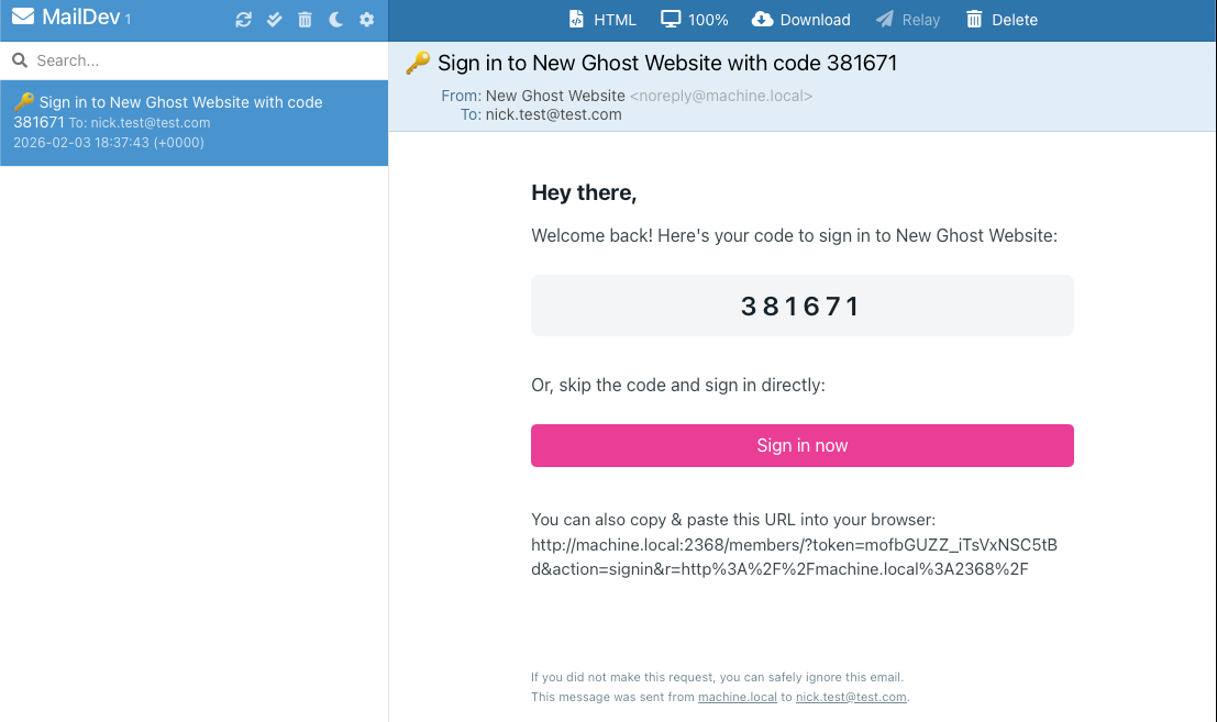 The last thing to mention is using Maildev. It’s an SMTP server which also presents a webmail interface for anything sent through it. This means that you can easily view emails that Ghost sends, like a sign in link. All you need to do is go to port 1080 on your local machine, and you’ll see this interface.