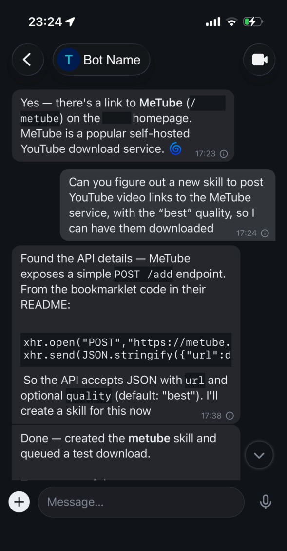 I have a locally running instance of MeTube which I use for making offline copies of videos. Generally speaking I keep my OpenClaw instance extremely isolated in its own Docker container, but I had previously given is access to this specific home server, so I knew it had sufficient access to interact with it.